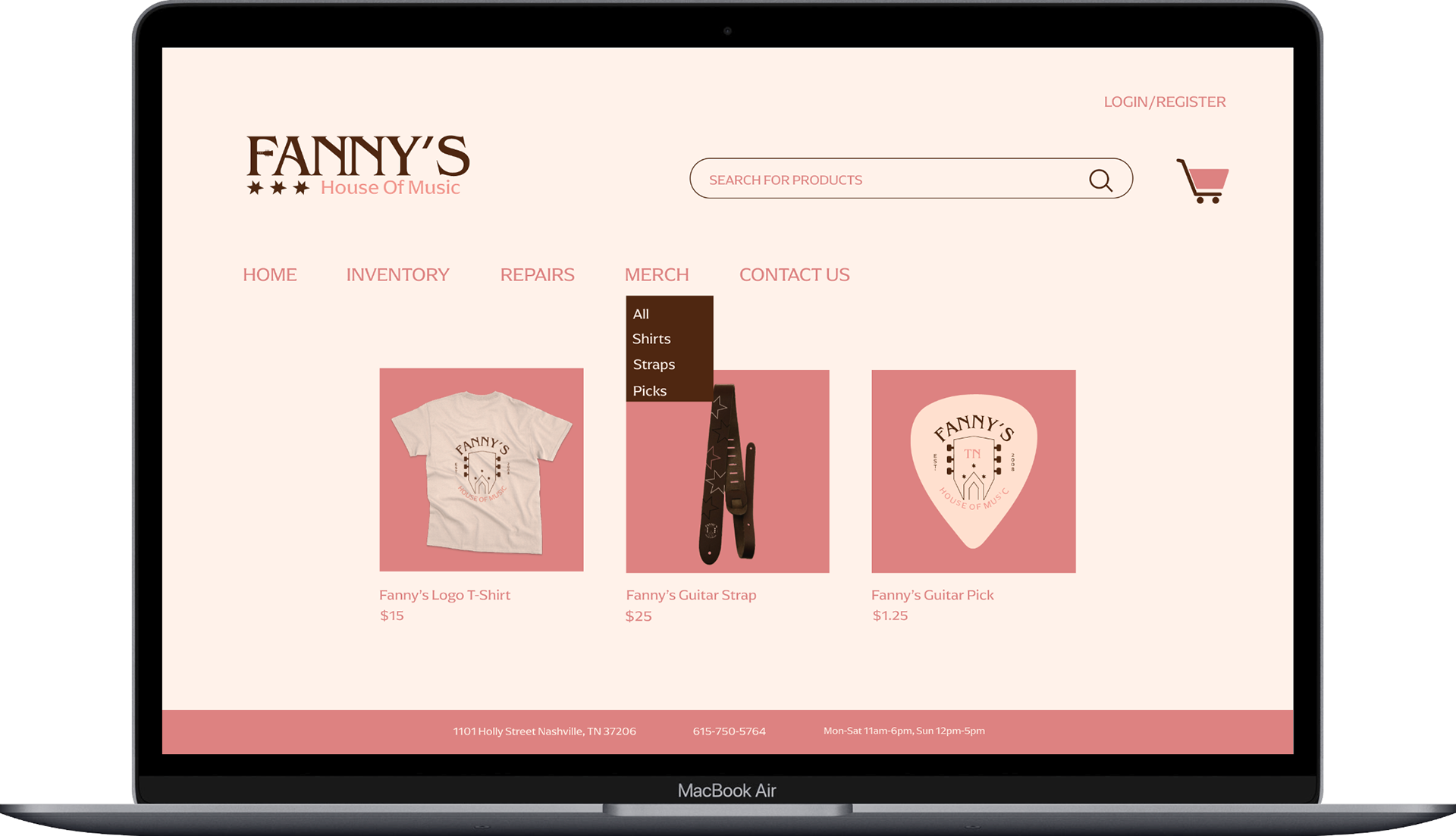 For this rebranding project, I created a new logo, and a poster, updated the merch, and made a new website and billboard. While creating the logo, I chose to incorporate the house in a new way by adding it to a guitar headstock. I created a more modern and simplified badge logo. I created a new poster to show the various products Fanny's carries. I designed a new website that reflects the rebrand. I also created a billboard since the store is in a city where it would be more visible to people passing by.